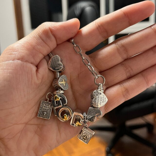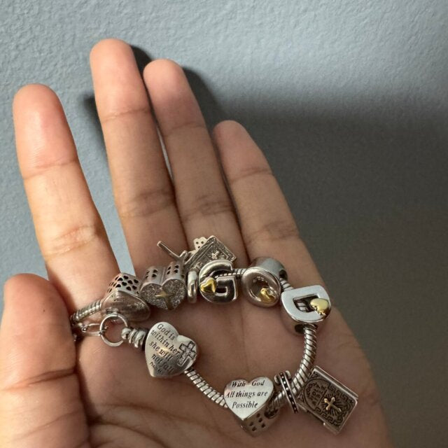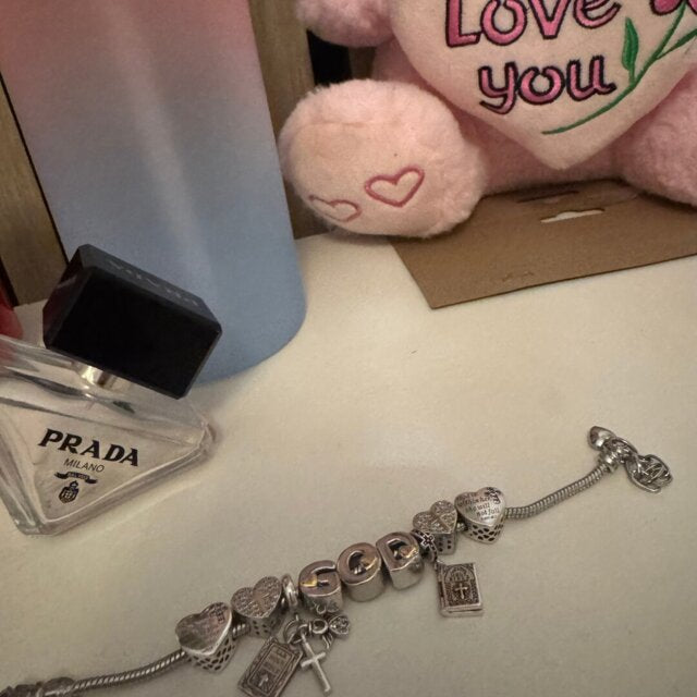 A beautiful expression of devotion. This silver charm bracelet features sacred symbols like the Bible and Cross, blending a clean, modern aesthetic with a heart for Christ. Simple, elegant, and rooted in faith.